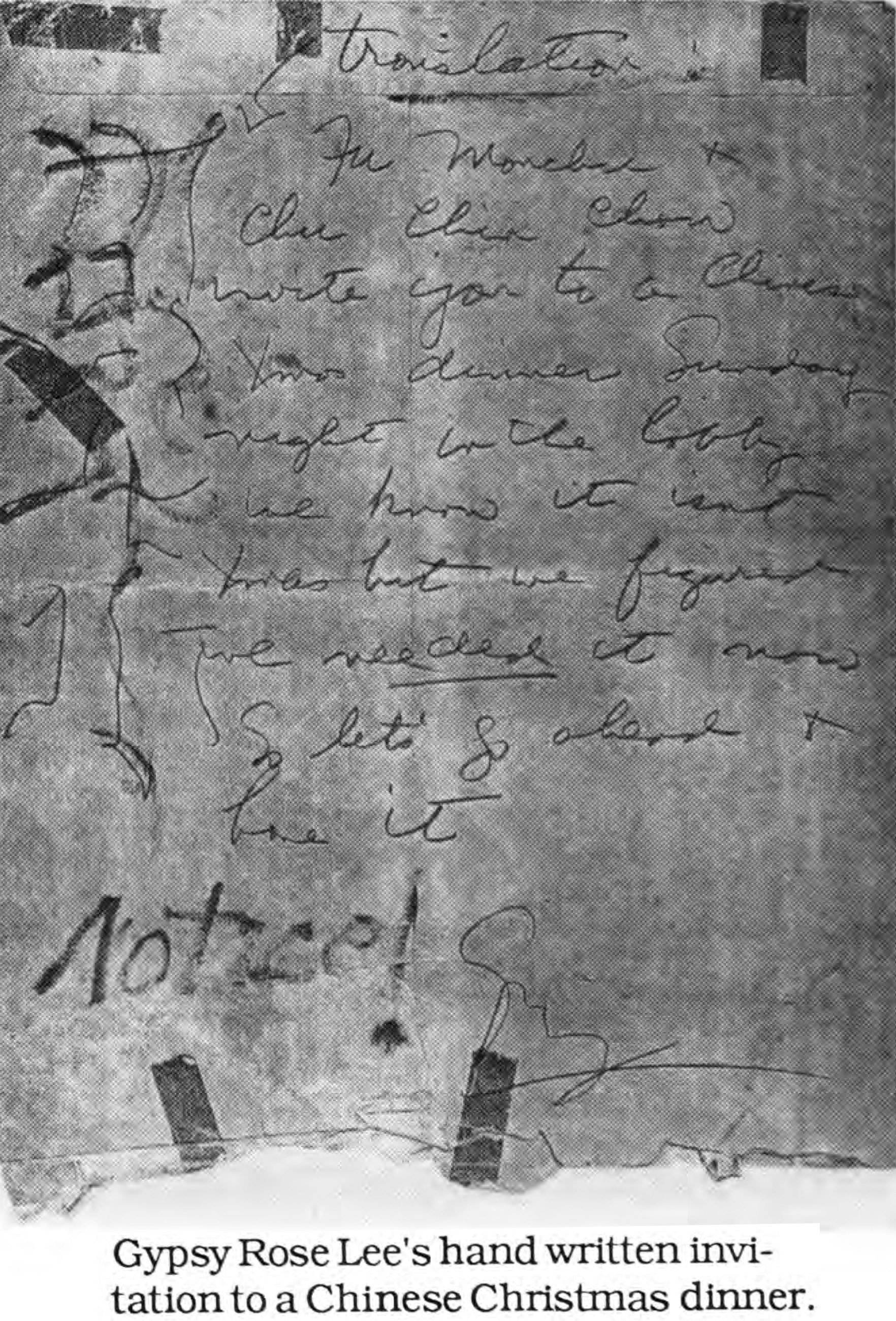 Gypsy Rose Lee celebrated "Christmas in August" by throwing a Chinese Banquet, inviting all actors, crew, and staff of "A Curious Evening with Gypsy Rose Lee" (1960-1961 season)." This invitation, written on a torn manila envelope, reads: Foo Man Choo and Choo Chin Chow invite you to a Chinese Christmas Dinner Sundaynight in the lobby. We know it isn't Christmas, but we figured we needed it now, so let's go ahead and have it!"