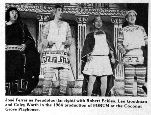 L-R: Robert Eckles, Lee Goodman, Coley Worth, Jose Ferrer in a scene from "A Funny Thing Happened on the Way to the Forum" during the 1964-1965 season.