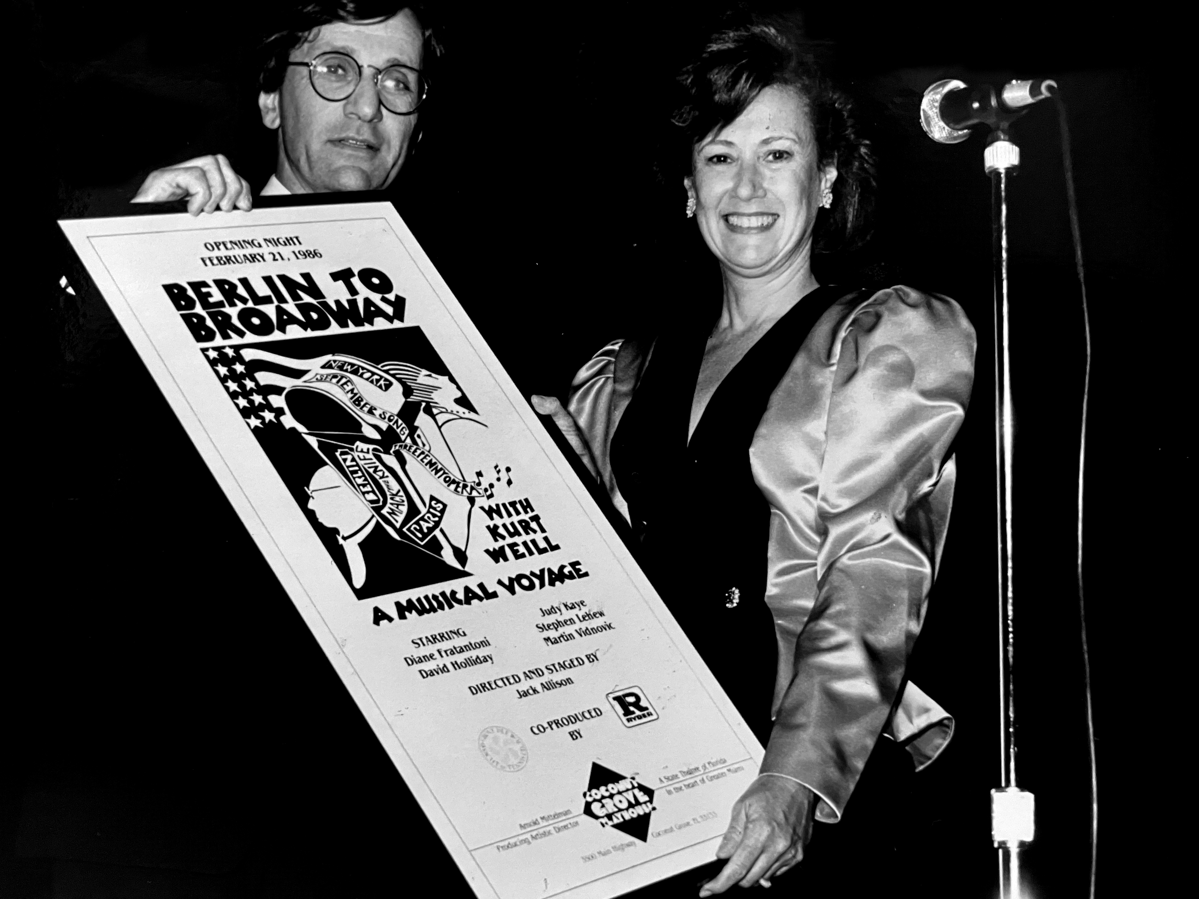 Ann Davis presents commemorative plaque to Lorraine Charney of Ryder Systems, Inc. on the opening night of "Berlin to Broadway with Kurt Weill" during the 1998-1999 season.
