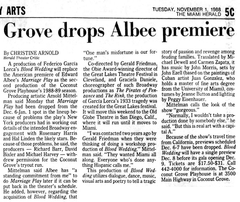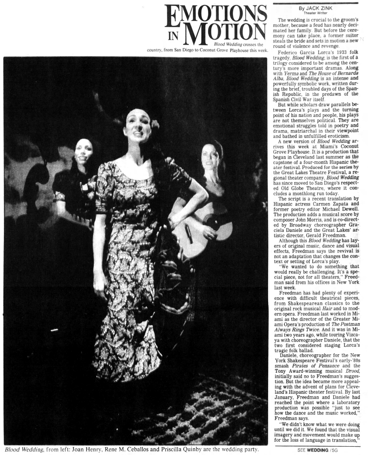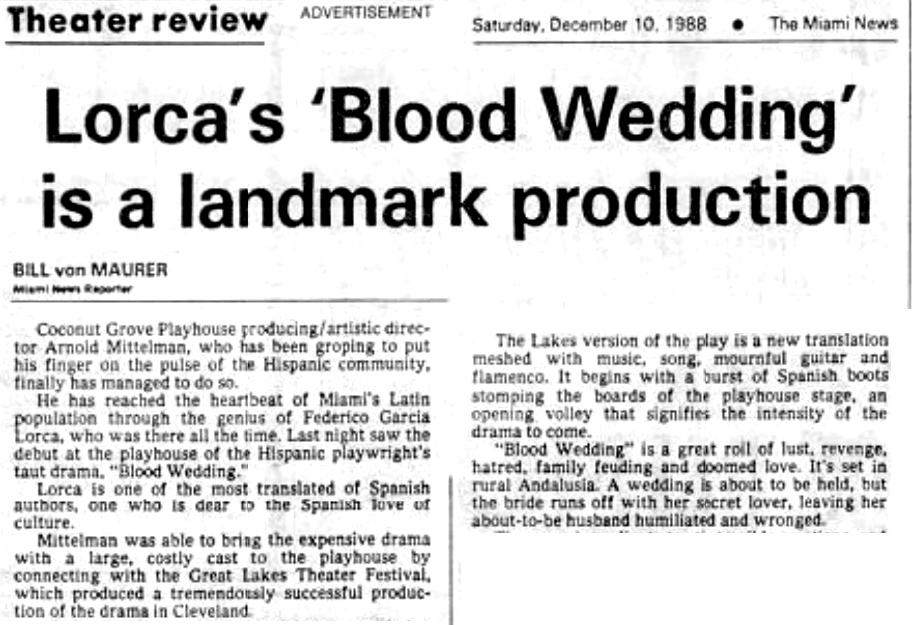 “Blood Wedding” by Federico Garcia Lorca is a tragic tale that revolves around themes of love, fate, passion, and the consequences of societal expectations in Spain. It was co-produced with the Tony Award-winning Old Globe Theatre of San Diego