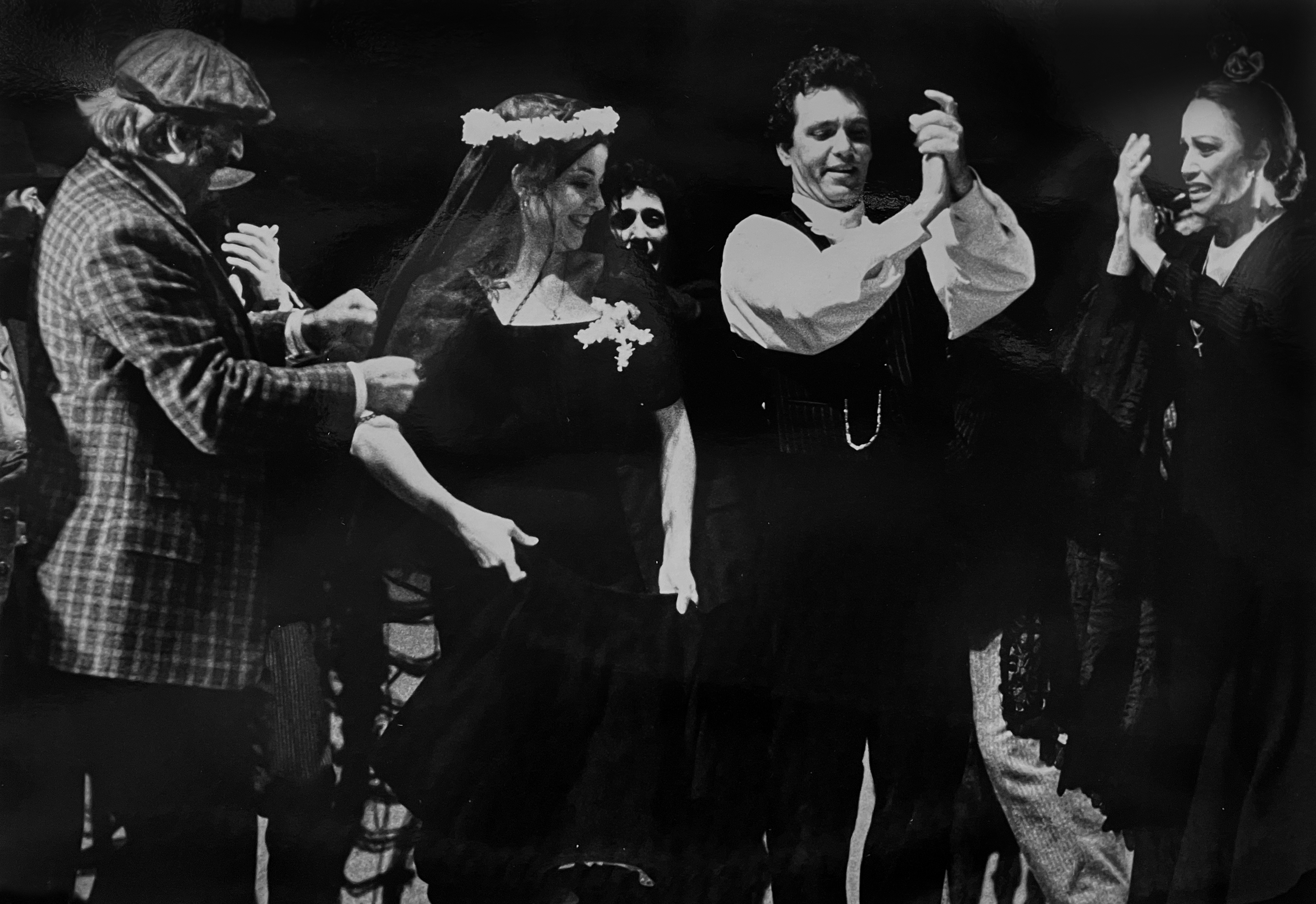 The wedding scene from "Blood Wedding," Federico Garcia Lorca's powerful international classic, during the 1988-1989 season. Pictured L-R: Hal Robinson, Josie DeGuzman, Aurelio Padron, and Jane White.