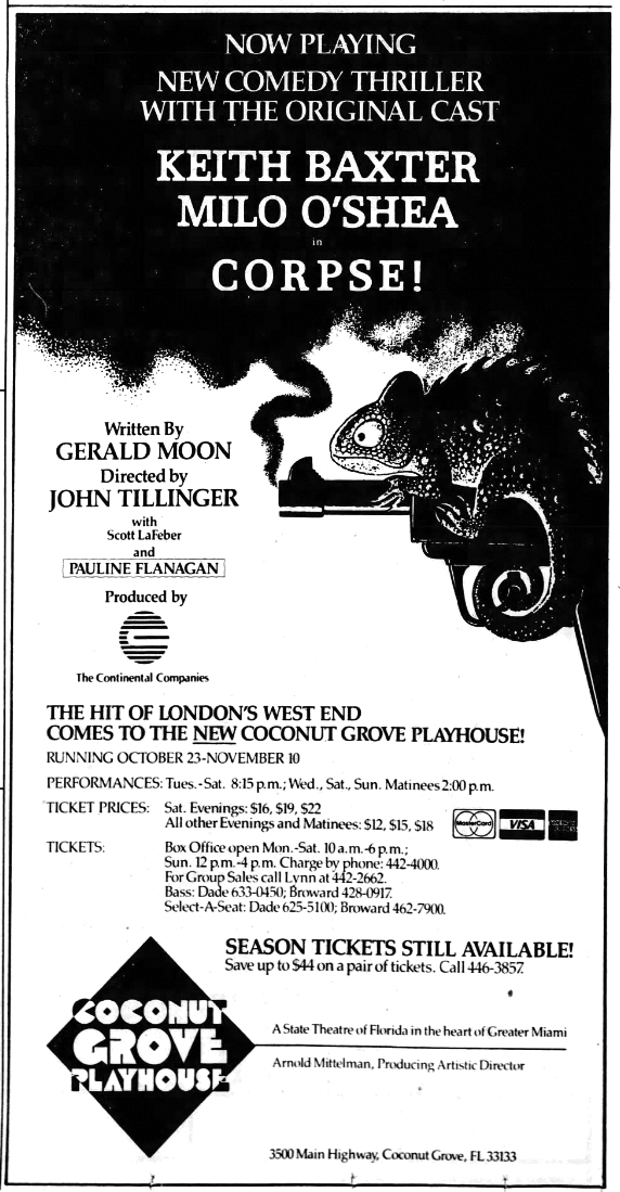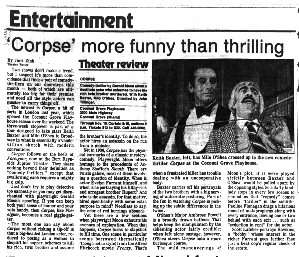 “Corpse” starring Keith Baxter and Milo O’Shea by Gerald Moon is a dark comedy centered around Evelyn Farrant, a successful and manipulative actress, and her meek twin brother, Rupert. When Evelyn unexpectedly dies, Rupert devises a plan to assume her identity and continue her career. It moved from the CGP to an open-ended run on Broadway at the Helen Hayes Theater