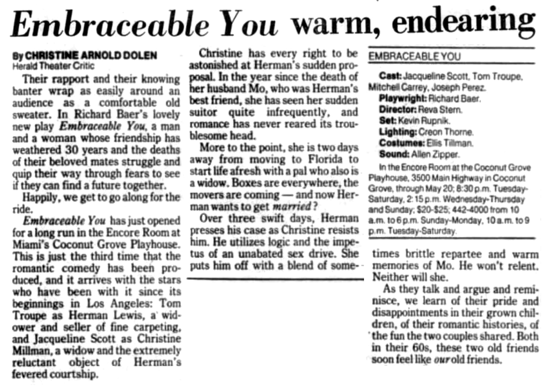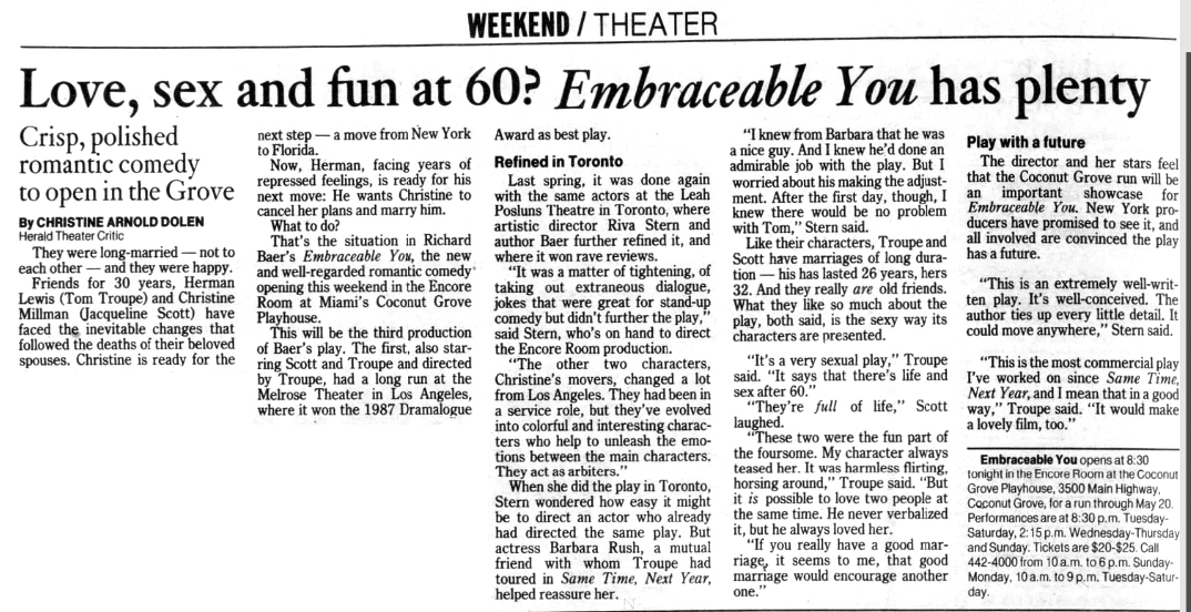 “Embraceable You” by Richard Baer is a romantic-comedy about a 30 year relationship between a man and women. Show re-opened on Broadway with the new title Mixed Emotions.