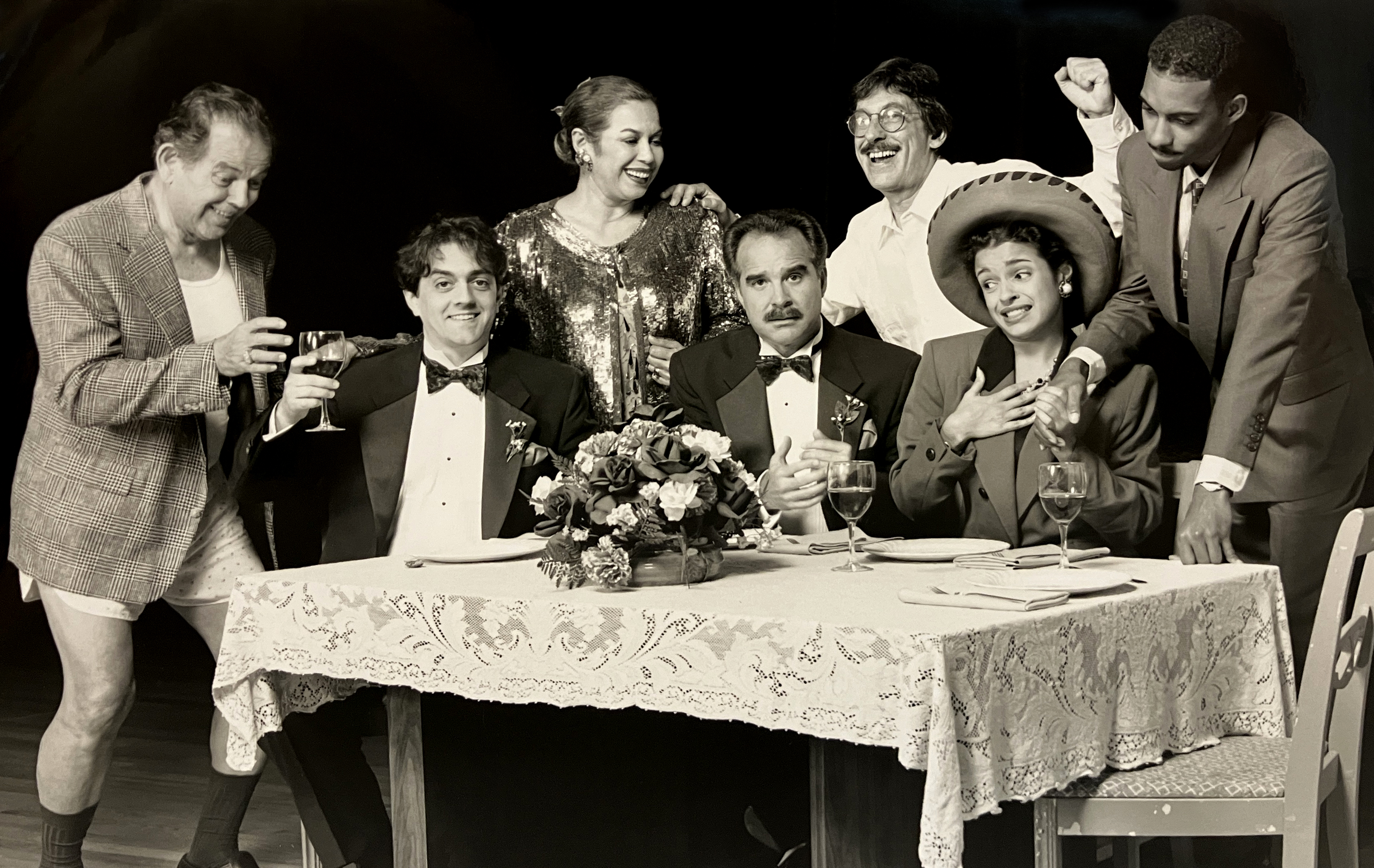 (Standing L-R) John Rodaz, Marta Velasco, Emiliano Diez and Kristina Rodriguez, (Sitting L-R) Salvador Levy and Andy Nobregas are featured in Rafael V. Blanco's bittersweet comedy "Falling Fidel" during the 1994-1995 season.