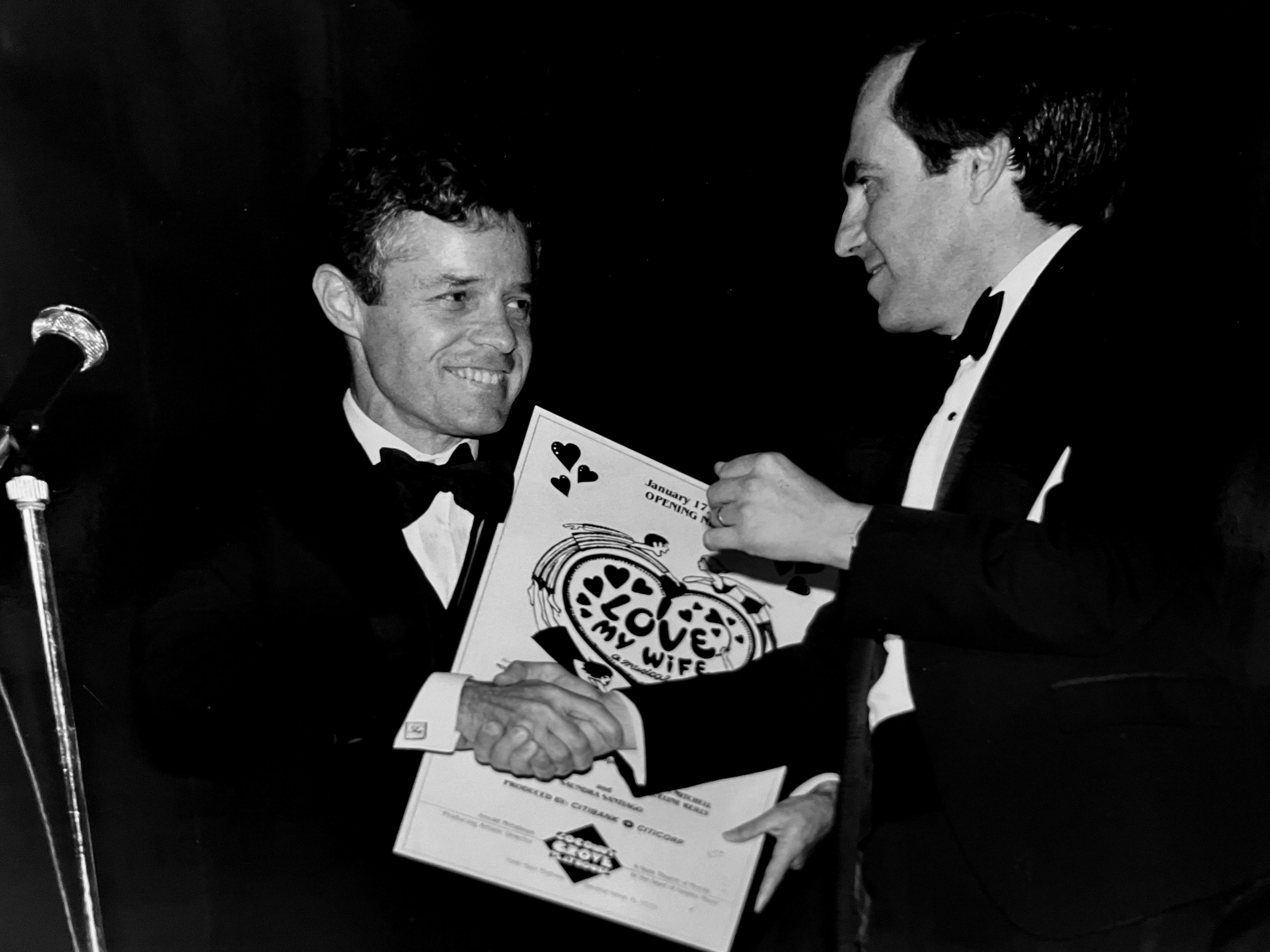 Tom Noonan of Citicorp accepting a commemorative plaque from Marshall Taylor on the opening night of "I Love My Wife" (1985-1986 season).