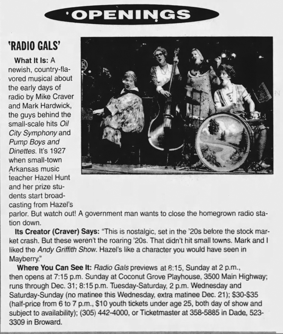 “Radio Gals” by Mike Craver and Mark Hardwick is a musical comedy is set in the 1920s and centers around the character of Hazel, a lively and imaginative woman who operates a small radio station in a rural town.