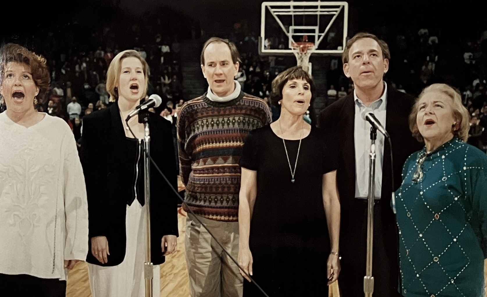Cast of "Radio Gals" singing the National Anthem at the Miami Heat game, December 26, 1995.