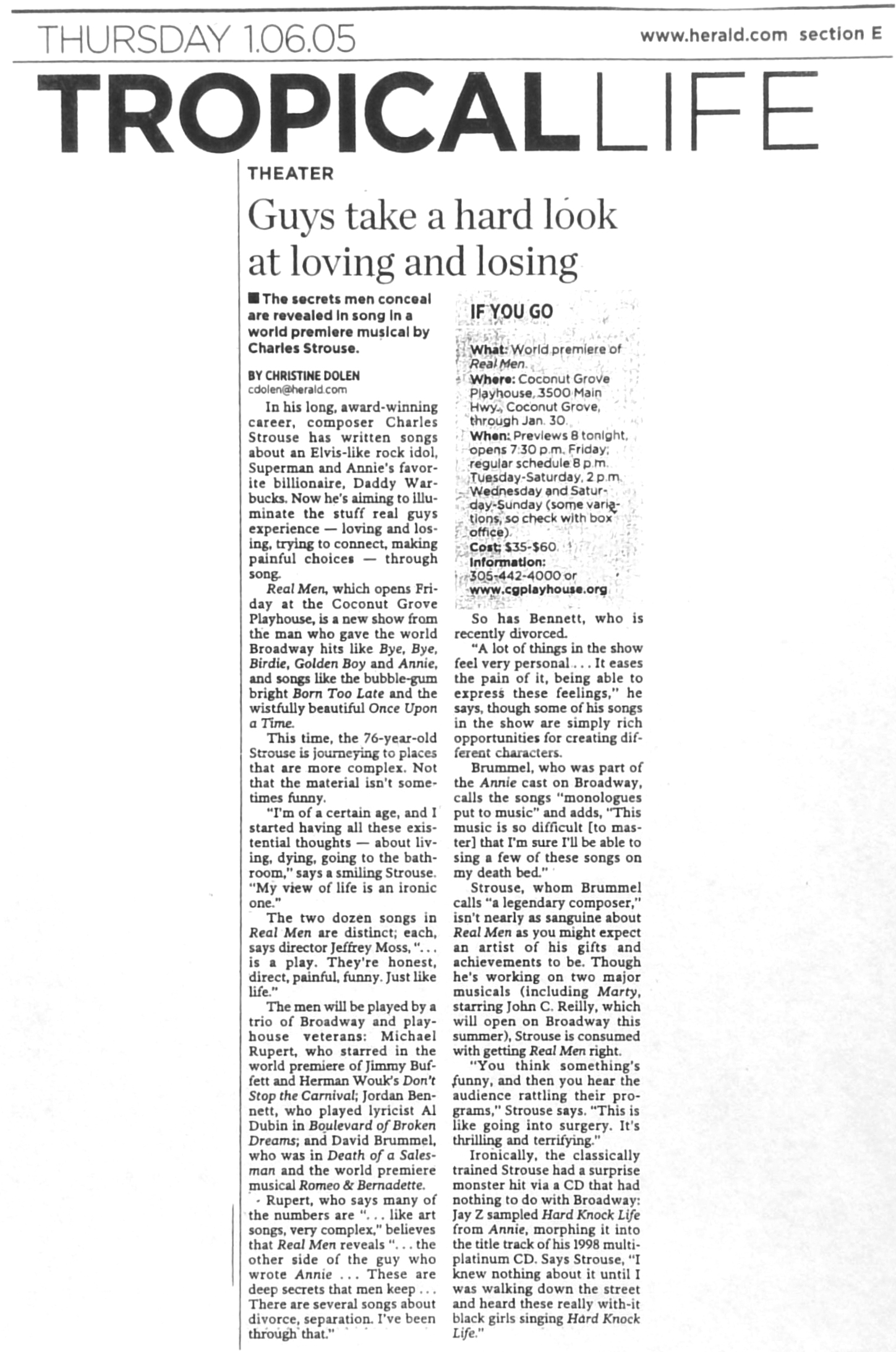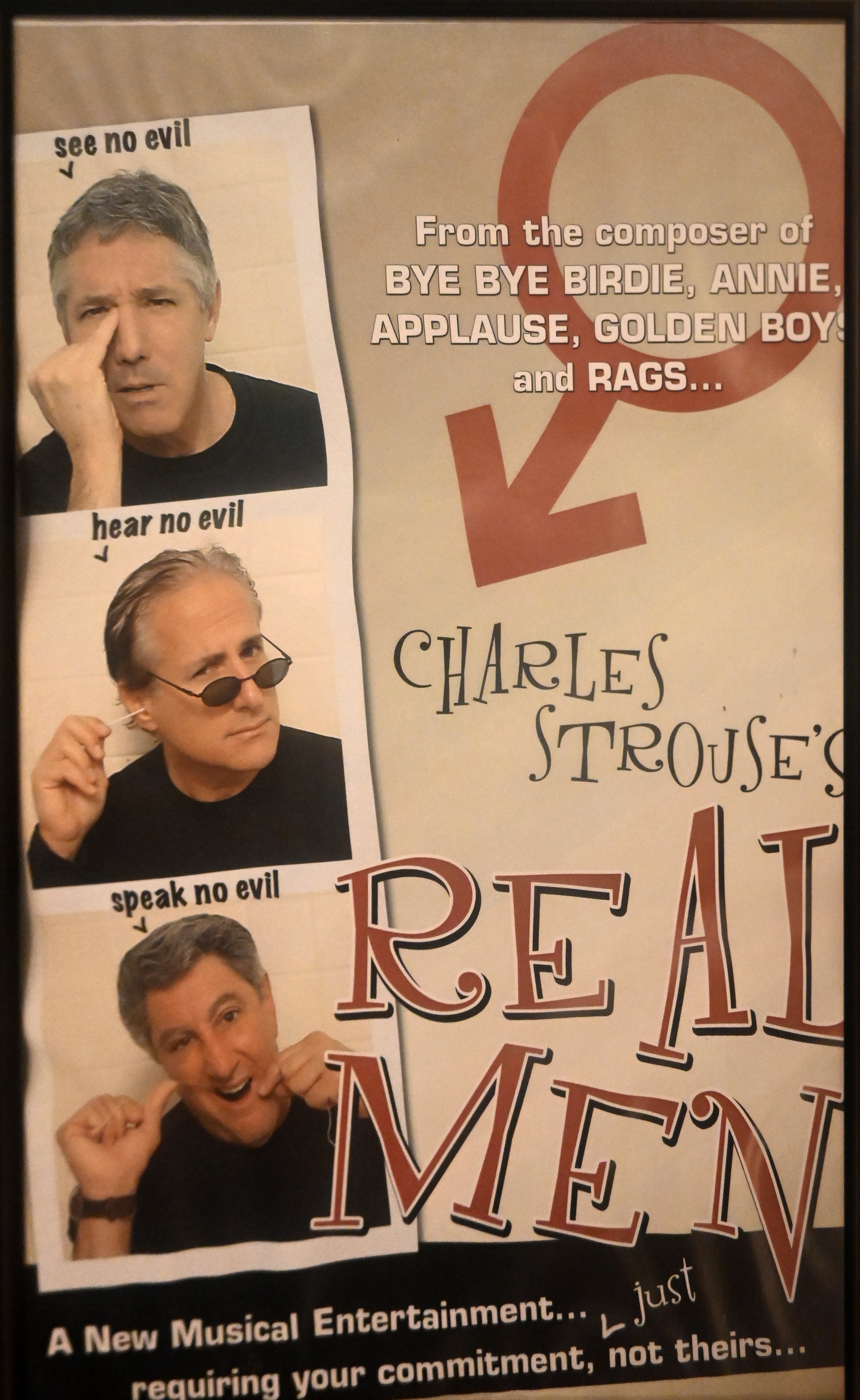“Real Men” is a world premiere musical with music and lyrics by Charles Strouse featuring Michael Rupert, exploring a series of songs in play form that examines middle aged men, single and married.