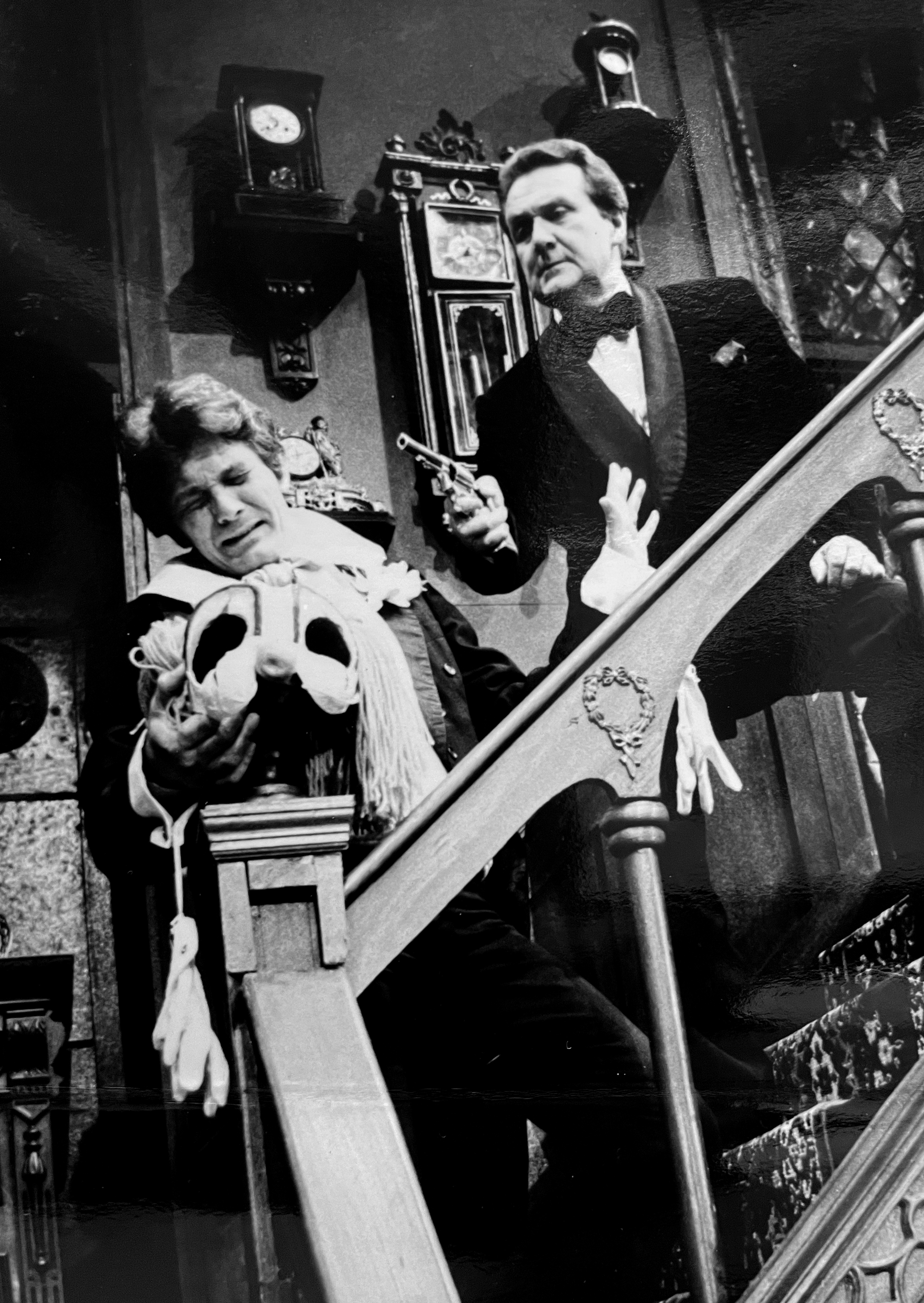 Jordan Christopher and Patrick McNee in "Sleuth" during the 1974-1975 season.