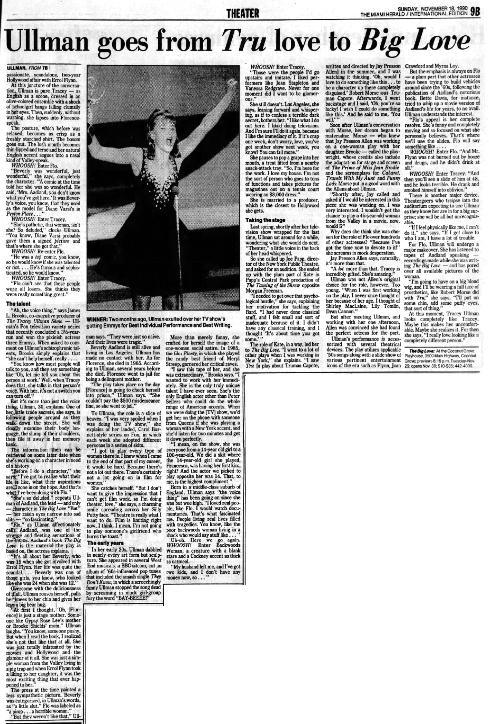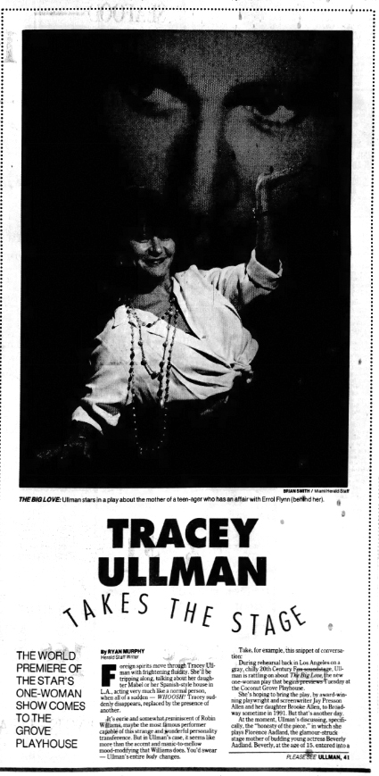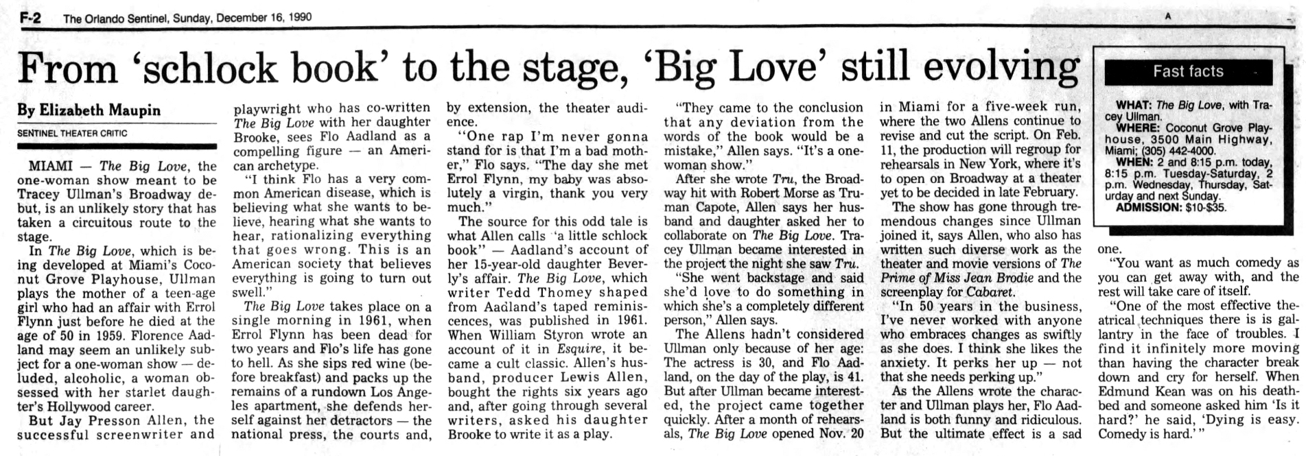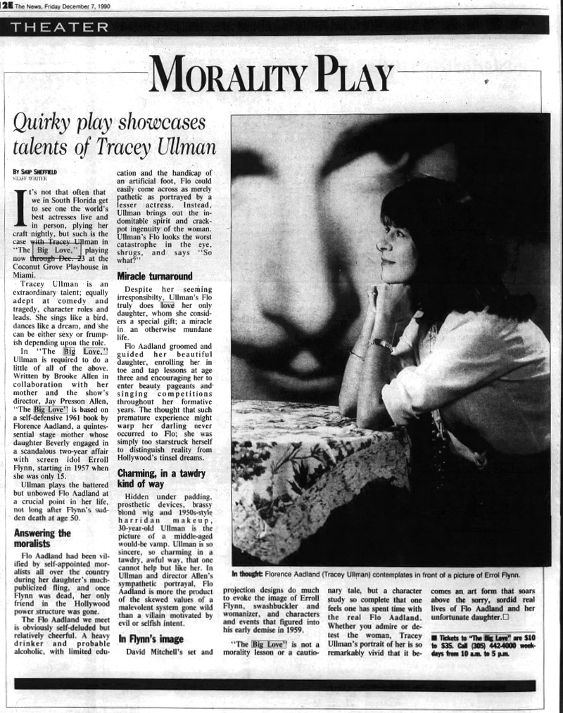 “The Big Love” is a world premiere comedy by Brooke and Jay Presson Allen, starring Tracey Ullman that examines the complexities of a mother whose daughter is having an affair with the legendary movie star, Errol Flynn. Production transferred directly to Broadway.