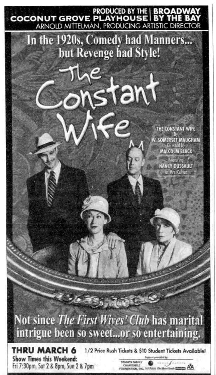 “The Constant Wife” by W. Somerset Maugham is a period tale of marriage, and the recognition on the part of the dallying husband on how fortunate he is to have met the right women. Co-production with Walnut Street Theater of Philadelphia, winner of the Carbonell Award for “Best Production in South Florida.”