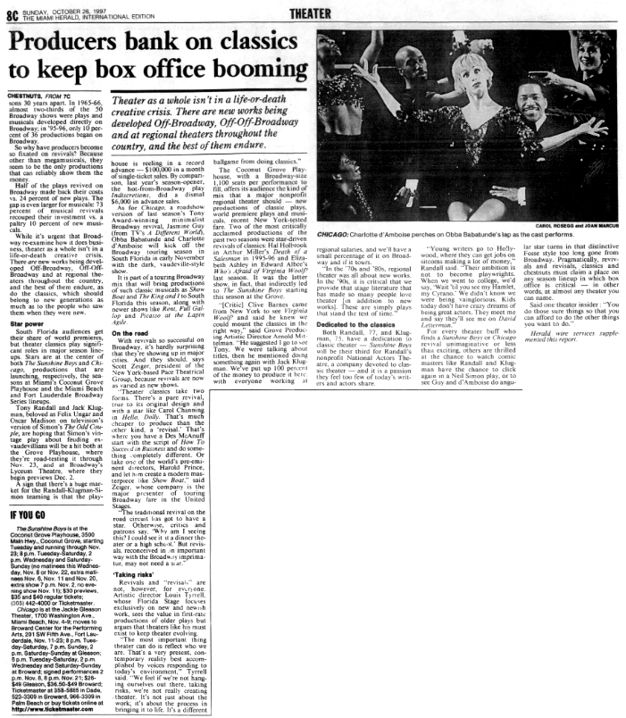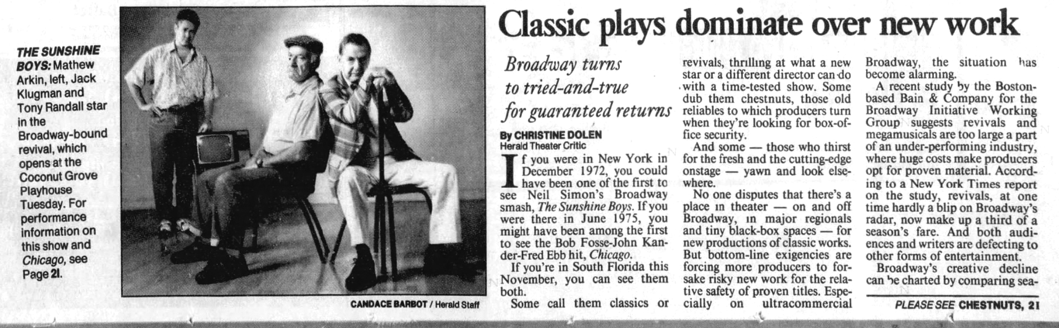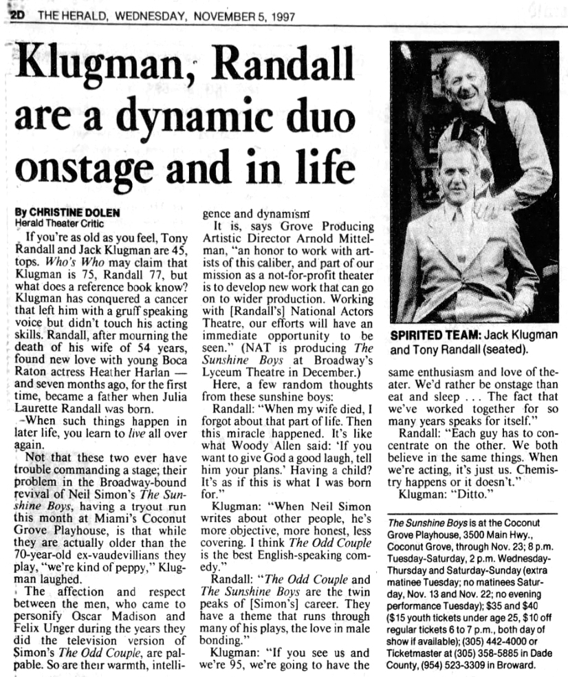 Tony Randall and Jack Klugman starred in "The Sunshine Boys" during the 1997-1998 season.
